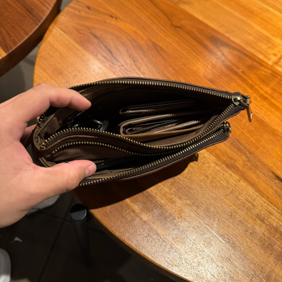 Fabricado en piel de alta calidad ofrece un espacio ideal y seguro para resguardar tus pertenencias como smartphone, billetera, cargador, billetes, pasaporte y mas